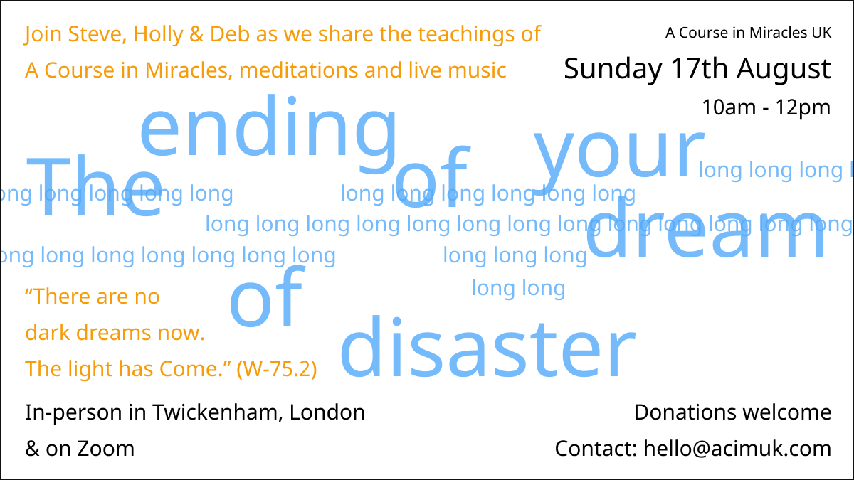 OnlineWe recognize the need for healing, for understanding and above all for forgiveness. We are making a conscious choice to awaken from all false beliefs in separation, sacrifice and limitation. In these sessions we are illuminating the practice, principles and essential experience of the spiritual mind-training of A Course in Miracles. It offers those willing, an extraordinary journey of self-discovery. It's purpose is to undo the obstacles to the awareness of Love's presence which is our natural inheritance.